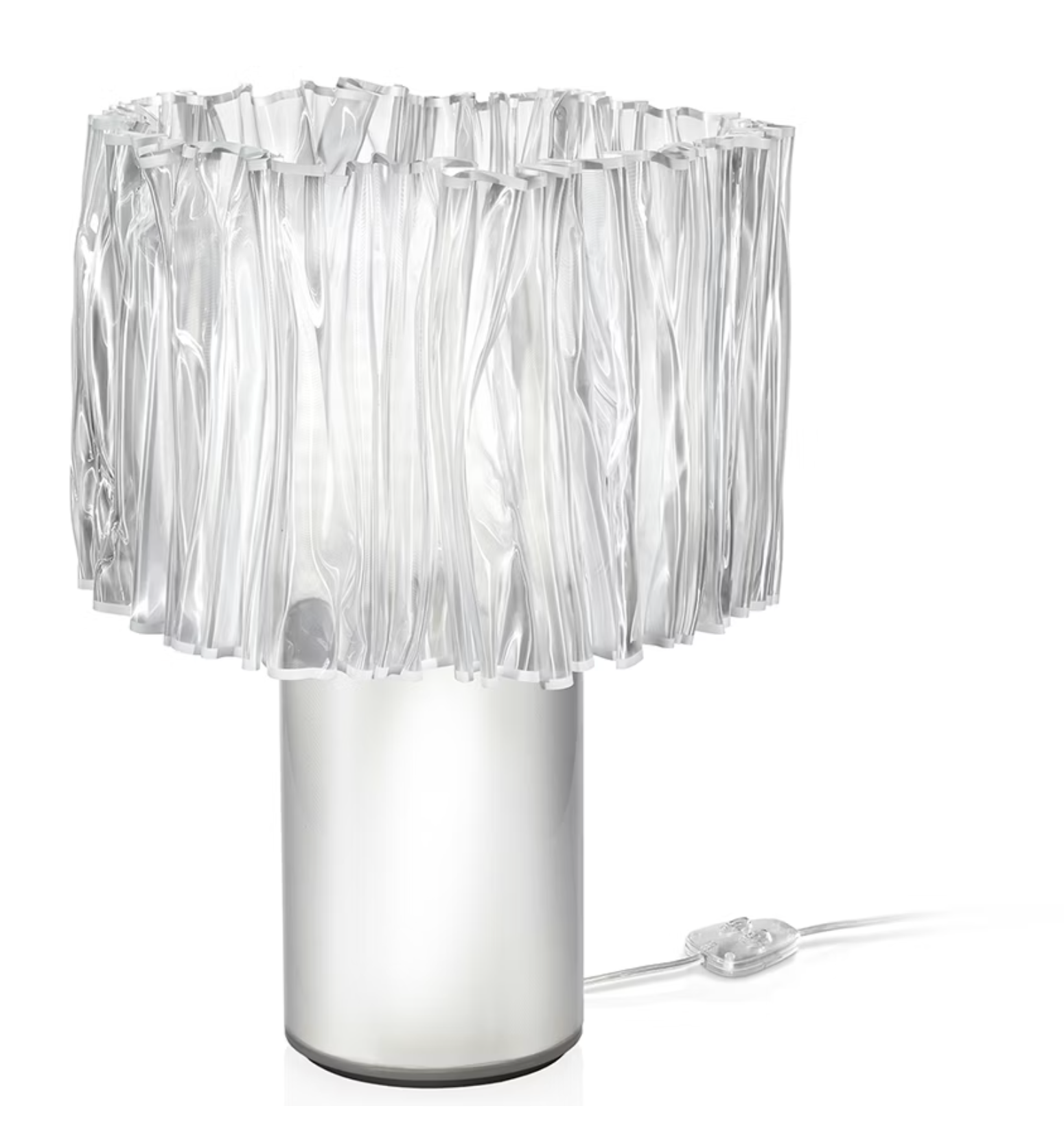 The Accordéon collection represents a new narrative in contemporary design: Slamp’s exclusive Lentiflex® material is heated and hand moulded by the women who tailor light. Every piece is one of a kind, but the lamps are identical. A thin steel plaque on the side of each lamp is inscribed with “Handmade in Italy”, attesting to the product’s unique design. The internal structure and clasp match the fluidity of the external plissé diffusor and prevent the accumulation of dust. The lamp has dual switches, one for the shade and another for the base. Both light sources can be used together, and cast a uniform glow and a cotton-like silhouette. The table lamp’s shade and sockets have magnets to facilitate cleaning and changing the bulbs.